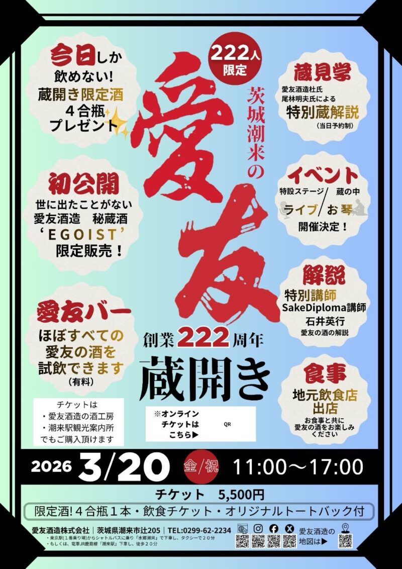 茨城県潮来市の愛友酒造 創業222周年記念「蔵開き」が開催されます。